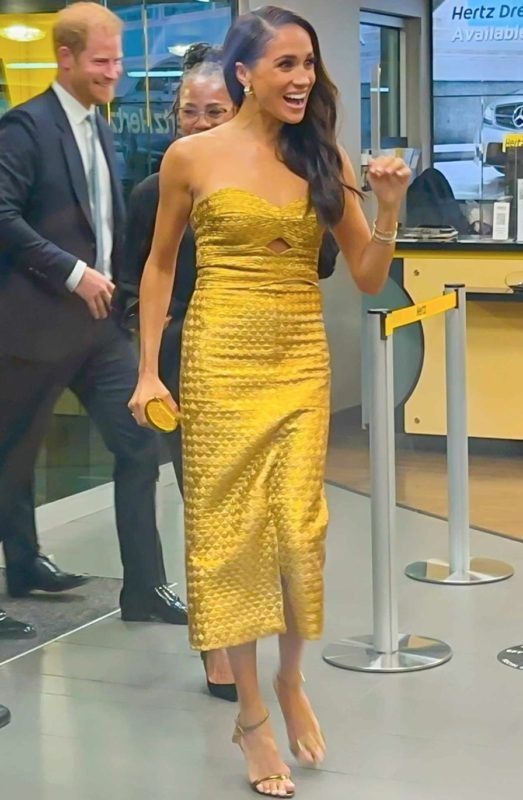 Meghan ha attirato l’attenzione di tutti i presenti con il suo abbigliamento. La sua strana mise dalle tonalità dorate non ha lasciato nessuno indifferente. La Markle indossava un abito d’oro scintillante, una borsa d’oro, orecchini d’oro e bracciali di diamanti.