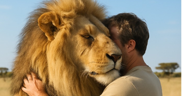 Il leone si avvicinò, si fermò a mezzo metro — e… lo spinse delicatamente con la testa contro il petto, come se volesse abbracciarlo.