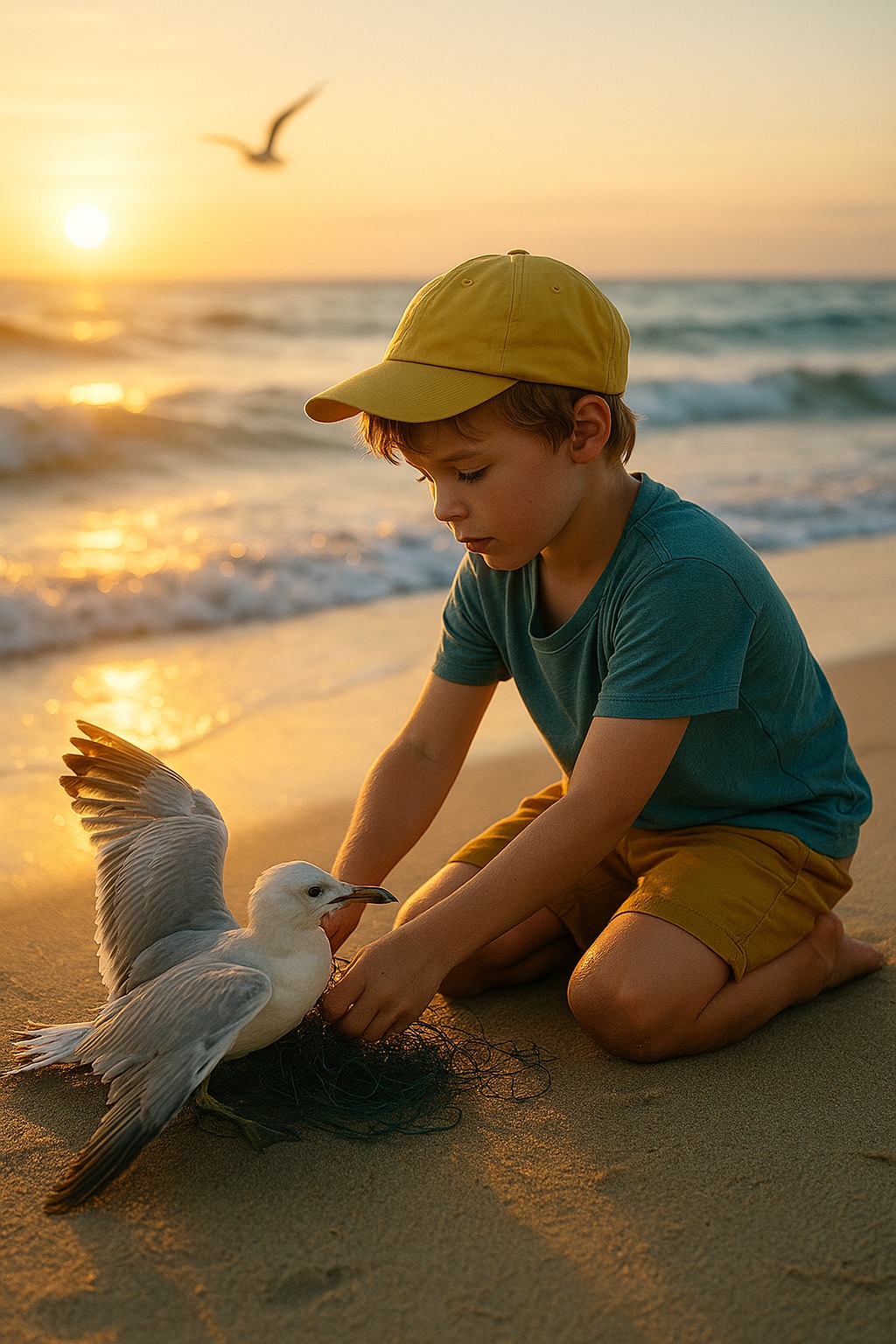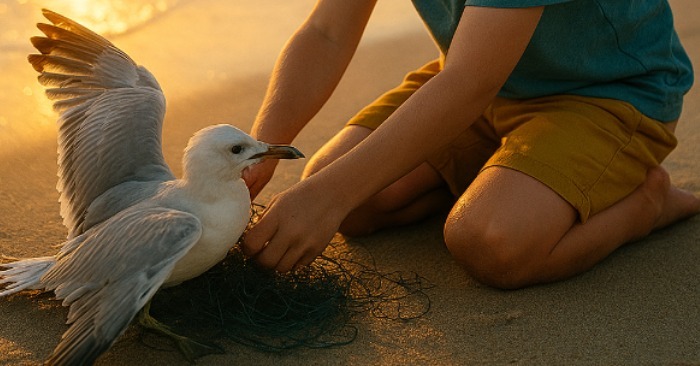 Un giorno notò un gabbiano impigliato in un pezzo di rete da pesca.