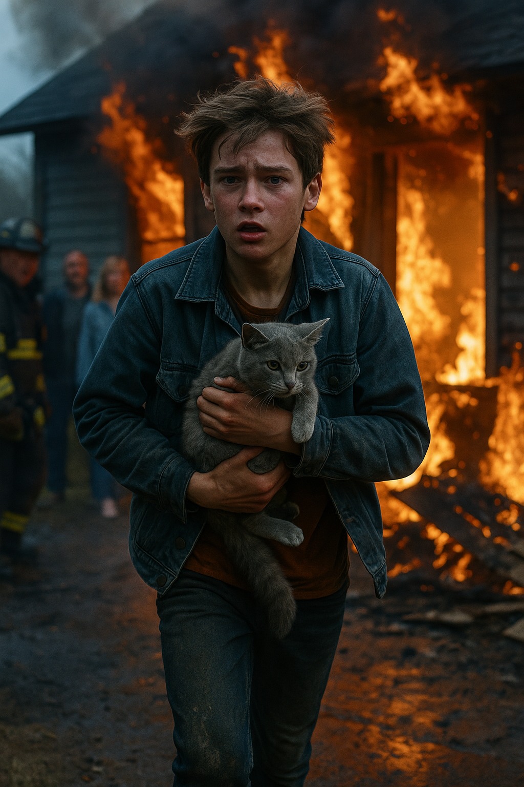 Tra i curiosi c’era Alex, un adolescente di 15 anni che viveva nelle vicinanze. Teneva in mano la bicicletta e non distoglieva lo sguardo dalla casa in fiamme. All’improvviso vide un movimento alla finestra del secondo piano: una piccola sagoma che tremava nel fumo. Un gattino, rannicchiato contro il vetro, miagolava lamentoso, incapace di uscire.