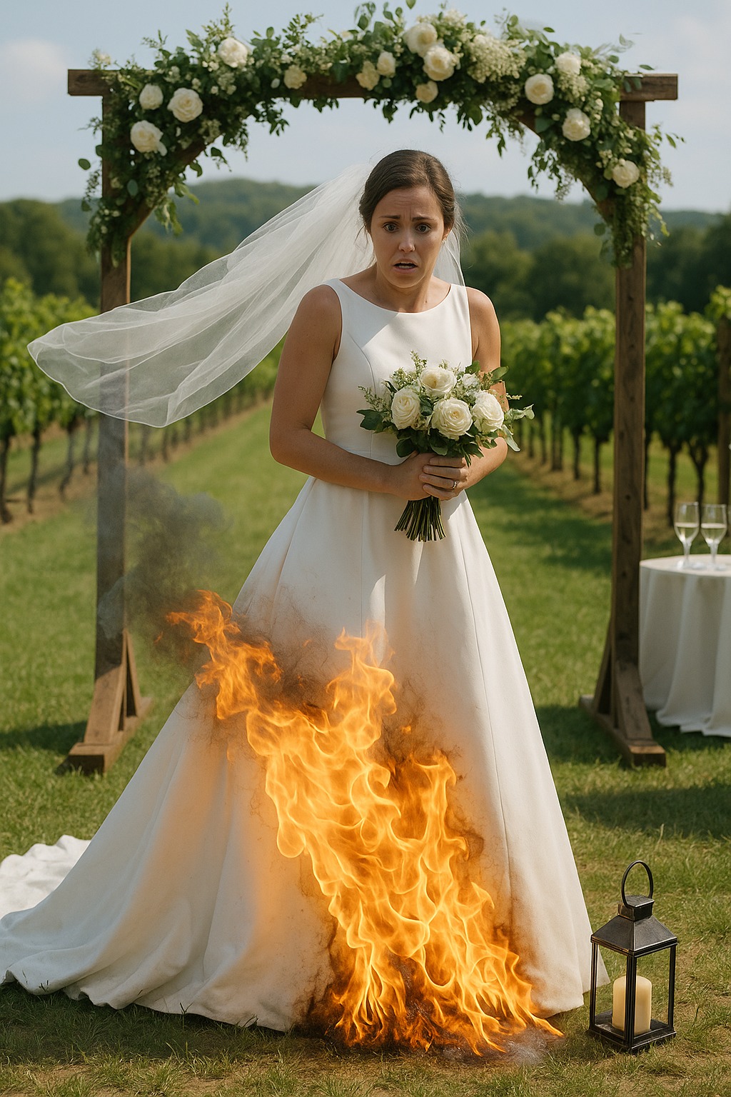 Nessuno notò che l’orlo dello strascico aveva toccato una piccola candela decorativa posizionata vicino al passaggio. Il vento si fece più forte e il fuoco avvolse immediatamente il tessuto.