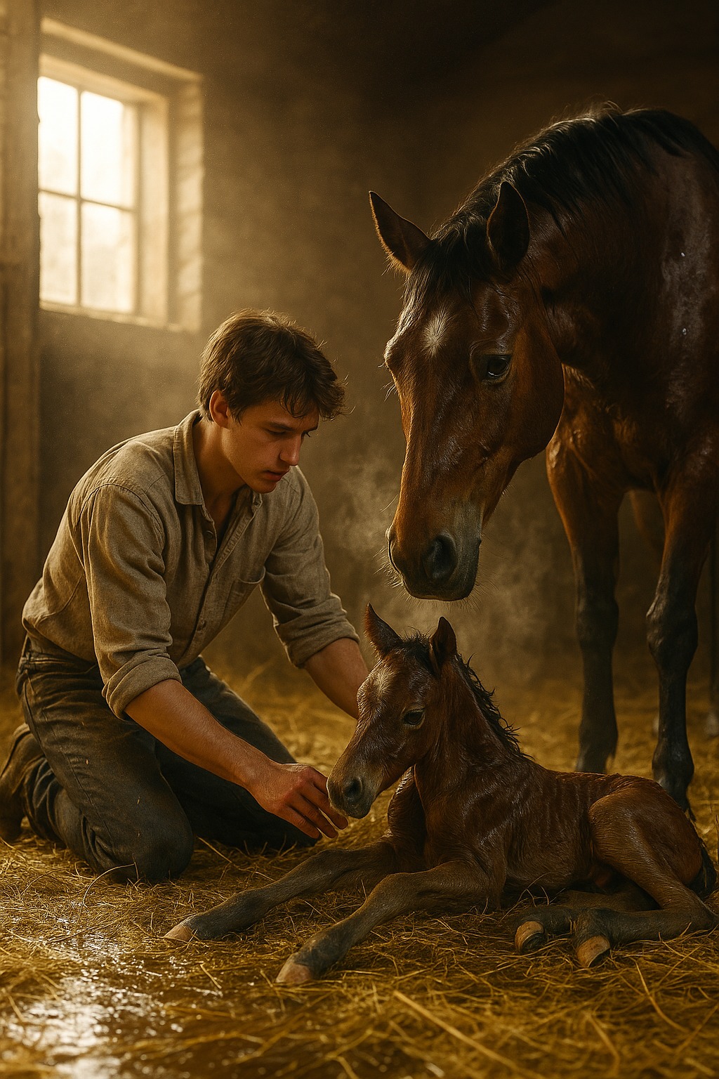 Luca stava lì vicino, accarezzando il collo caldo di Zvezda, sussurrandole qualcosa, non parole, solo suoni, per non farla andare nel panico. Il veterinario e l’assistente tiravano il puledro, la cavalla tremava, l’aria era densa di vapore e sangue. Finalmente, un debole fruscio. Sulla paglia apparve un piccolo puledro bagnato. Ma non respirava.