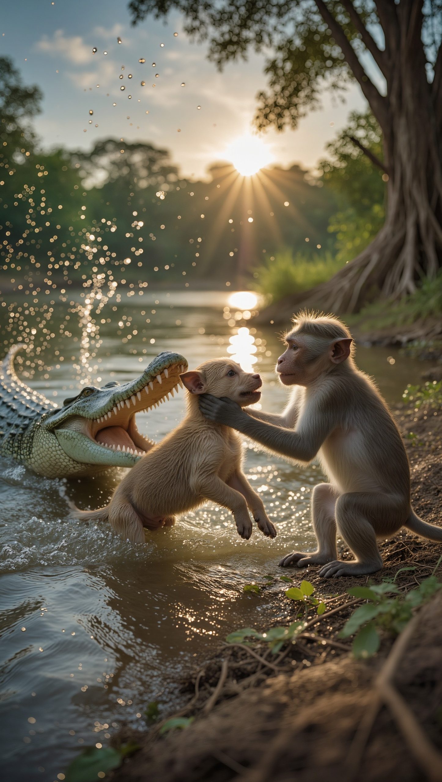 Saltò di nuovo sulla riva, stringendo il cucciolo al petto. La gente accorse. Il coccodrillo scomparve nelle profondità, l’acqua tornò calma. La scimmietta posò delicatamente il cucciolo sulla sabbia e, come se fosse un essere umano, iniziò a leccargli il pelo, spingendogli il muso.