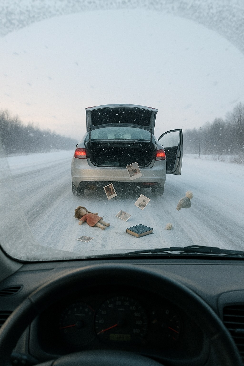 Poi, per un attimo, ho visto una bambola, con un vestito logoro e una treccia. È stata spazzata via dal vento ed è scomparsa sotto le ruote. L’auto davanti non ha rallentato. La portiera sbatteva contro la carrozzeria e continuavano a volare fuori strani oggetti, come se qualcuno all’interno cercasse di sbarazzarsi di qualcosa, con urgenza, disperatamente.