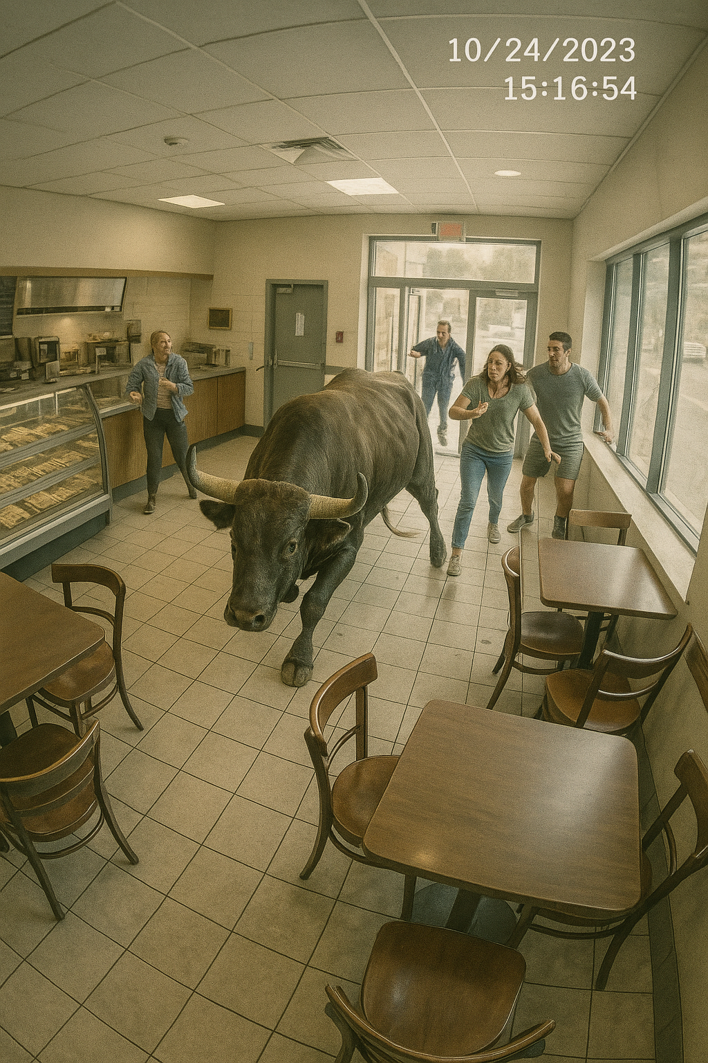Più tardi si capì che il toro era scappato da una fattoria lì vicino. Spaventato dai rumori forti, era scappato, aveva corso per strada e si era ritrovato per caso davanti alla vetrina illuminata: la luce si rifletteva sul vetro e lui aveva visto lì un altro toro, il suo riflesso. Non aveva attaccato. Cercava la strada per tornare indietro.