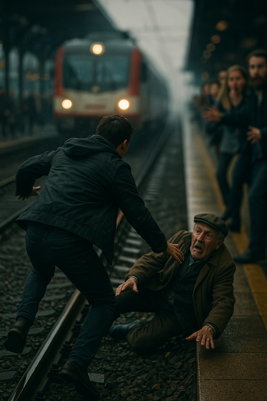 Corse verso l’anziano che giaceva a terra, incapace di alzarsi, lo afferrò per le spalle e cercò di sollevarlo. I binari erano scivolosi, il rumore assordante, il vento del treno in arrivo già gli sferzava il viso.