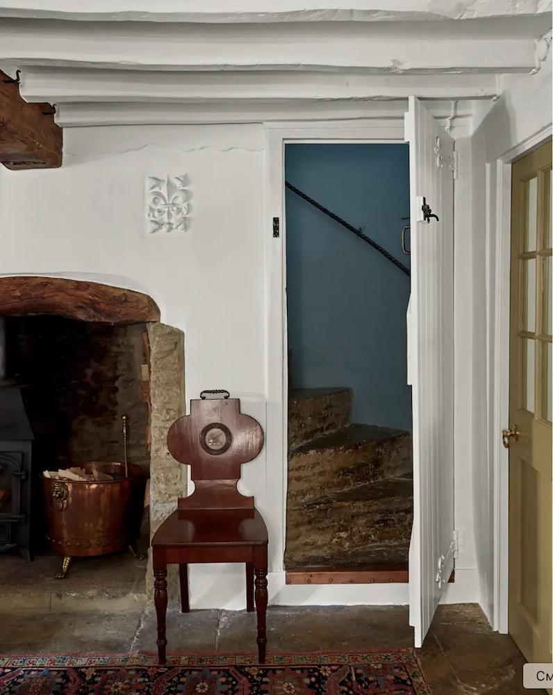 Al secondo piano, una scala in pietra del XVII secolo conduce alla camera da letto con un copriletto antico e tende in tessuto vintage. Ogni stanza sembra raccontare la sua storia: del passato, del gusto, del tempo che qui rallenta.