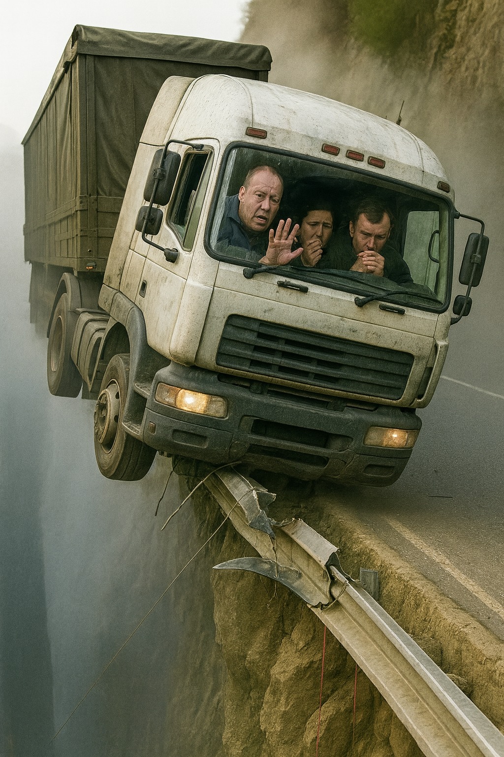 La strada di montagna era vuota e silenziosa quando un boato squarciò la nebbia mattutina. Un enorme camion bianco, perso il controllo in curva, sfondò il guardrail metallico e si fermò, sospeso sopra il precipizio.