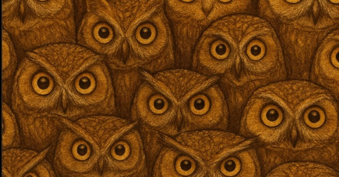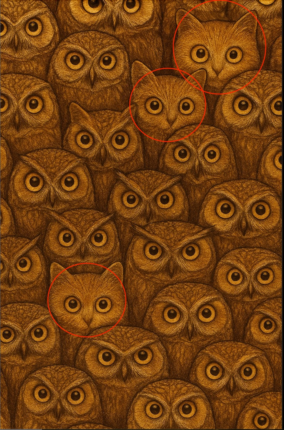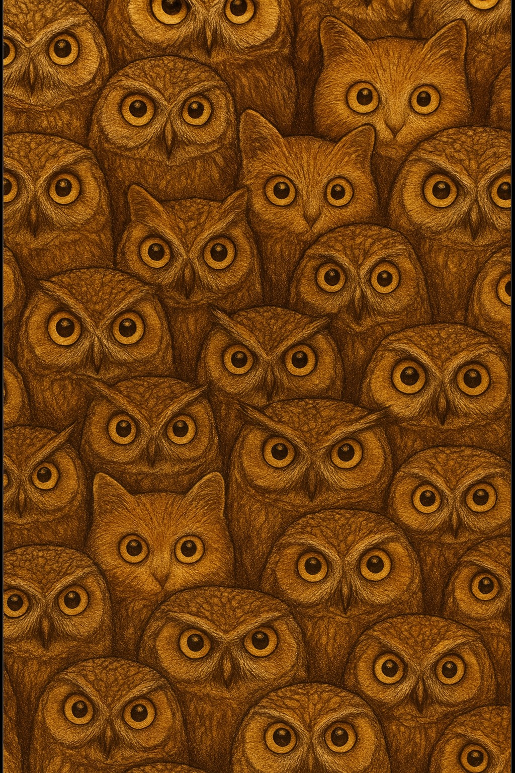 A prima vista sembra che l’immagine raffiguri semplicemente uno stormo di gufi dagli enormi occhi rotondi. Sono tutti quasi identici, si confondono in un unico motivo e guardano dritto nell’anima. Ma l’artista ha preparato una trappola: tra le decine di gufi si nascondono tre gatti, che si mimetizzano abilmente tra i loro vicini pennuti.