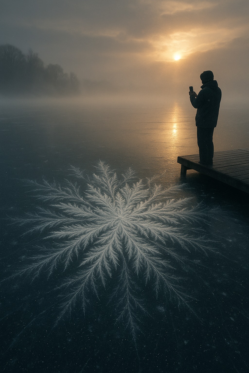 All’inizio era un motivo appena percettibile, come una crepa gelata. Ma in pochi secondi sottili linee bianche si diffusero su tutta la superficie del lago, intrecciandosi rapidamente tra loro come radici di piante o venature di foglie. Si diffondevano da un unico punto, come un fiore che sbocciava sotto il ghiaccio trasparente.