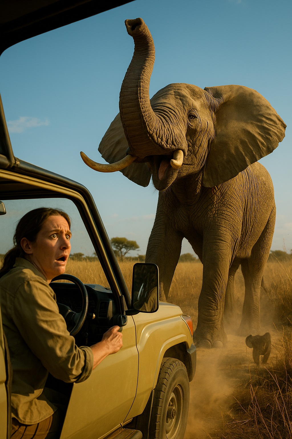 Quando l’auto si fermò vicino al letto asciutto del fiume per consentire ai turisti di fotografare un branco di zebre al pascolo in lontananza, dietro di loro apparve silenziosamente un elefante. Enorme, polveroso, con zanne imponenti, apparve così silenziosamente che sembrava essere spuntato dal terreno.