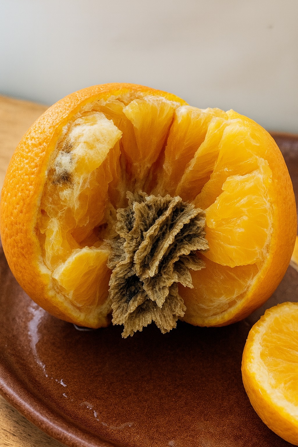 Il mio primo pensiero fu che all’interno fosse cresciuto un secondo, brutto “germoglio” di arancia. Ma sembrava che fosse andato fuori strada da tempo: consistenza friabile, bordi grigiastri e un odore sgradevole e umido, che non ricordava affatto gli agrumi.