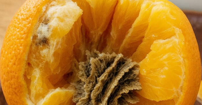 Il mio primo pensiero fu che all’interno fosse cresciuto un secondo, brutto “germoglio” di arancia. Ma sembrava che fosse andato fuori strada da tempo: consistenza friabile, bordi grigiastri e un odore sgradevole e umido, che non ricordava affatto gli agrumi.