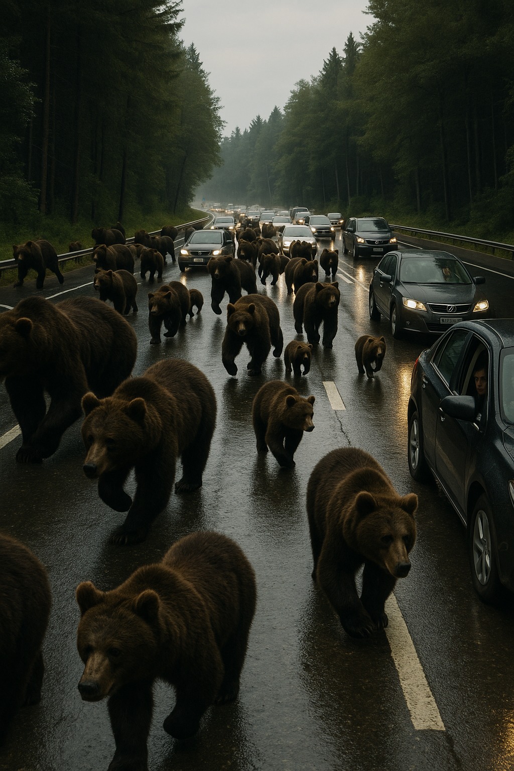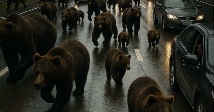 Uscirono dal bosco quasi contemporaneamente, in modo così brusco e potente che alcune auto rischiarono di scontrarsi. La gente urlò, i freni stridettero, qualcuno sbatté la testa contro il parabrezza. Nessuno capiva cosa stesse succedendo. Gli orsi non guardavano nessuna delle auto: correvano semplicemente avanti, come se la strada fosse per loro solo un ostacolo.