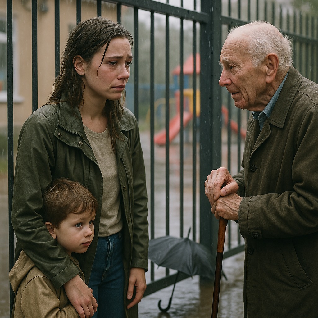 All’inizio Emma pensava che fosse solo un vicino solitario. Stava in piedi a pochi metri dal cancello, con le mani incrociate sul manico di un bastone consumato e una giacca grigia troppo sottile per il vento. Mentre i genitori entravano e uscivano di corsa, lui guardava solo il parco giochi, sbattendo spesso le palpebre, come se il sole del tardo pomeriggio gli facesse male agli occhi.