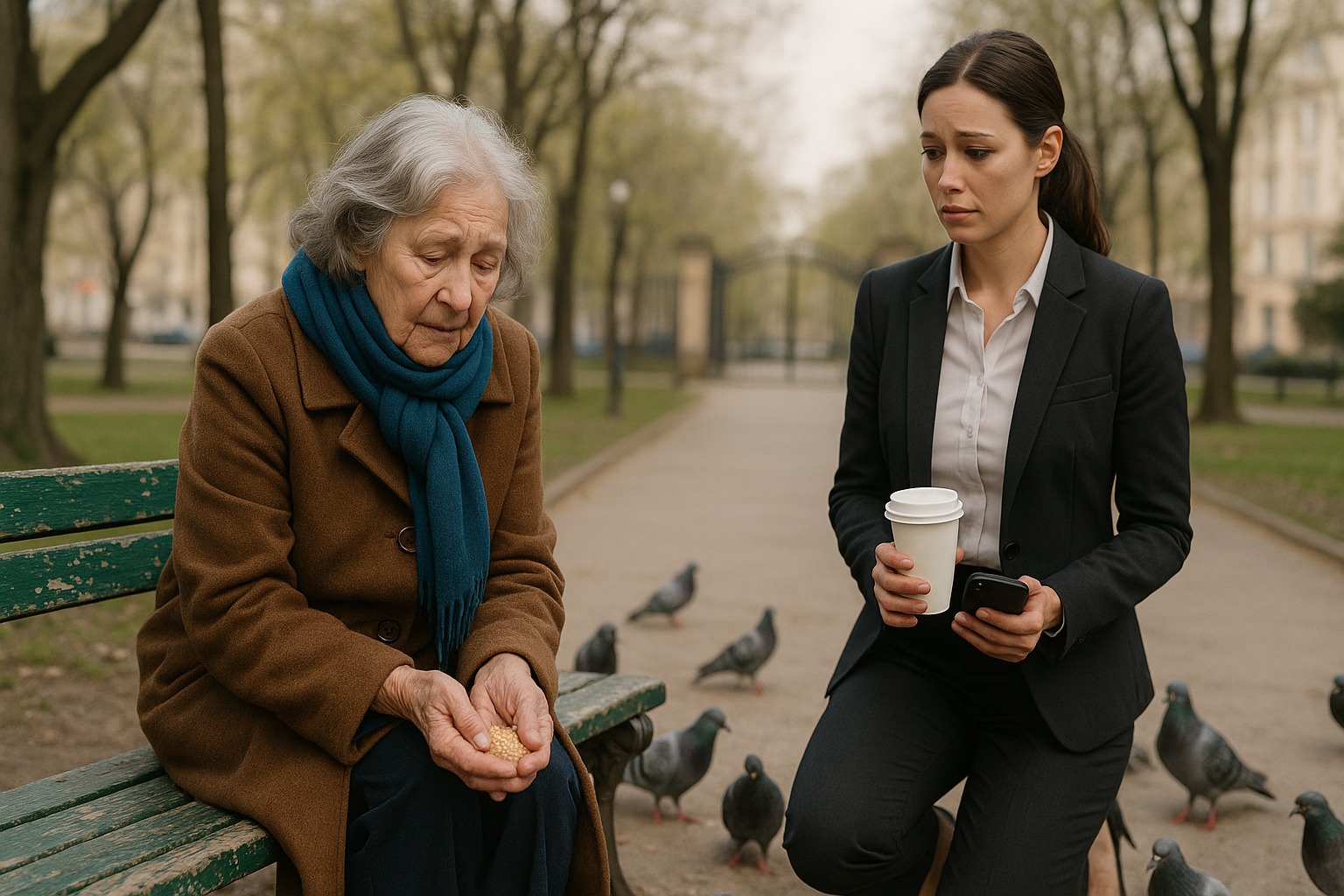 Emma la notò per la prima volta un martedì, mentre attraversava di corsa il piccolo parco cittadino con un caffè in una mano e il telefono nell’altra. La donna anziana era seduta sulla stessa panchina verde scrostata, con un cappotto marrone ben stirato abbottonato fino al collo e una sciarpa blu accuratamente annodata. Una busta di plastica con del pane era appoggiata sulle sue ginocchia. Spezzava piccoli pezzi, li gettava ai piccioni e, ogni minuto circa, alzava la testa per guardare il cancello del parco con una strana, luminosa aspettativa.