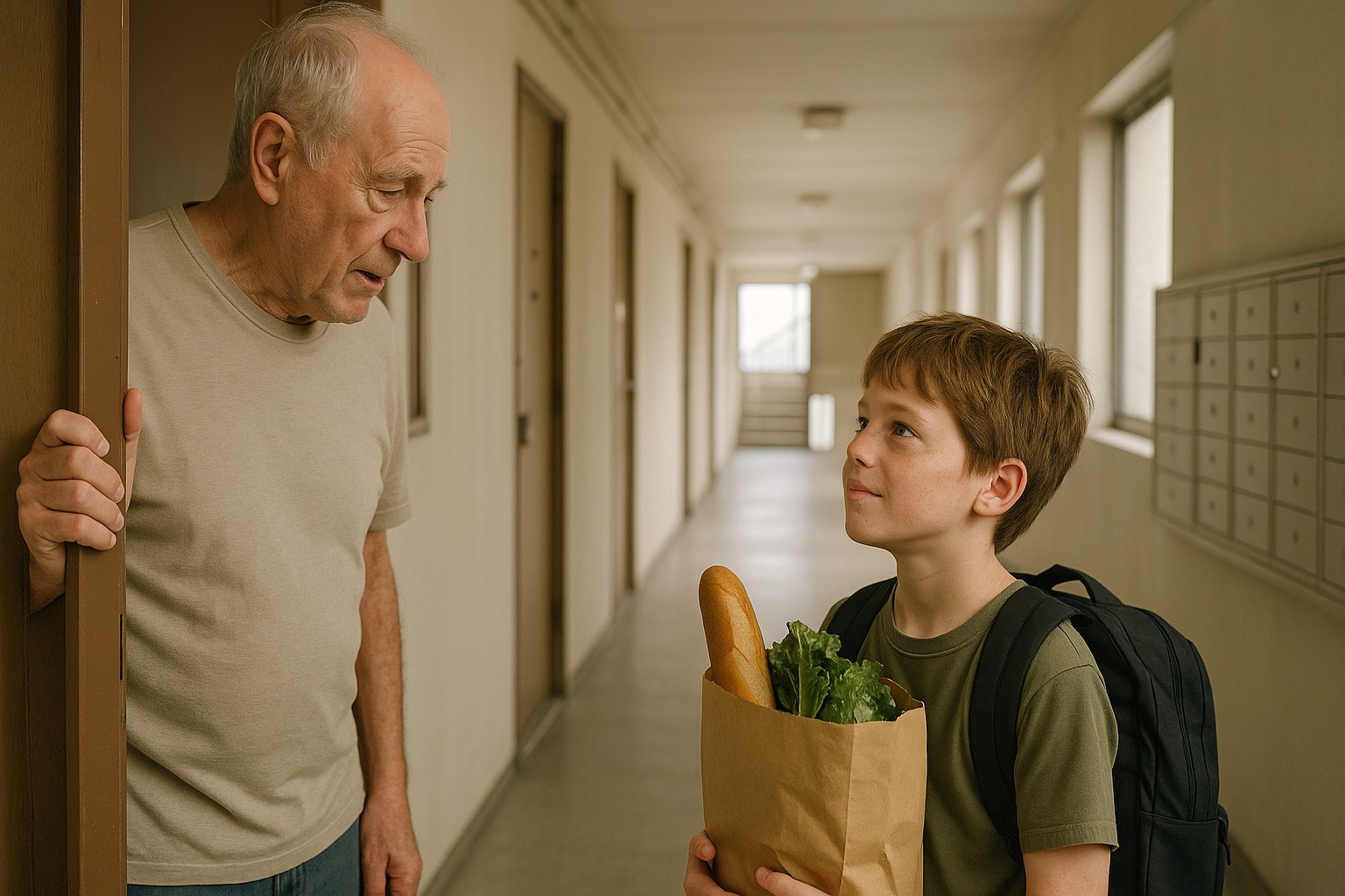 Aprì la porta pronto a dire al corriere che aveva sbagliato indirizzo. Invece, c’era un ragazzo di circa dieci anni, con le lentiggini, uno zaino quasi più grande di lui, che teneva con entrambe le mani una busta di carta della spesa.