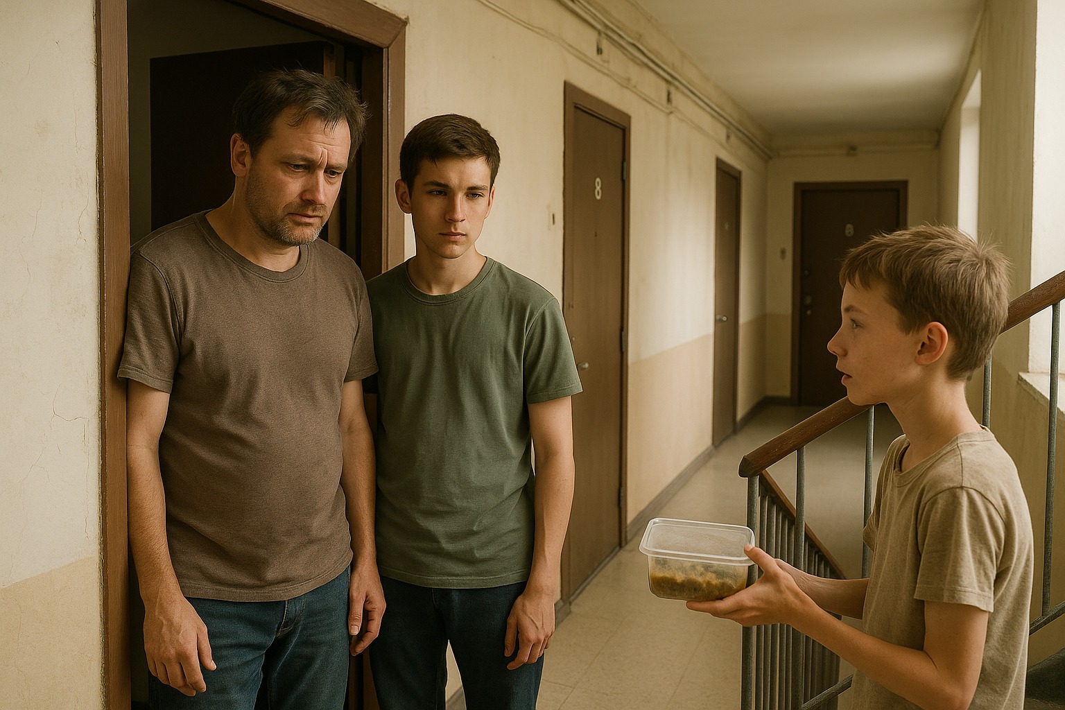 Un ragazzino magro, forse di dieci o undici anni, con una felpa sbiadita, stava posando con cura un contenitore sul nostro zerbino. Aveva i capelli spettinati e le scarpe da ginnastica troppo piccole. Si guardava intorno come un gatto spaventato.