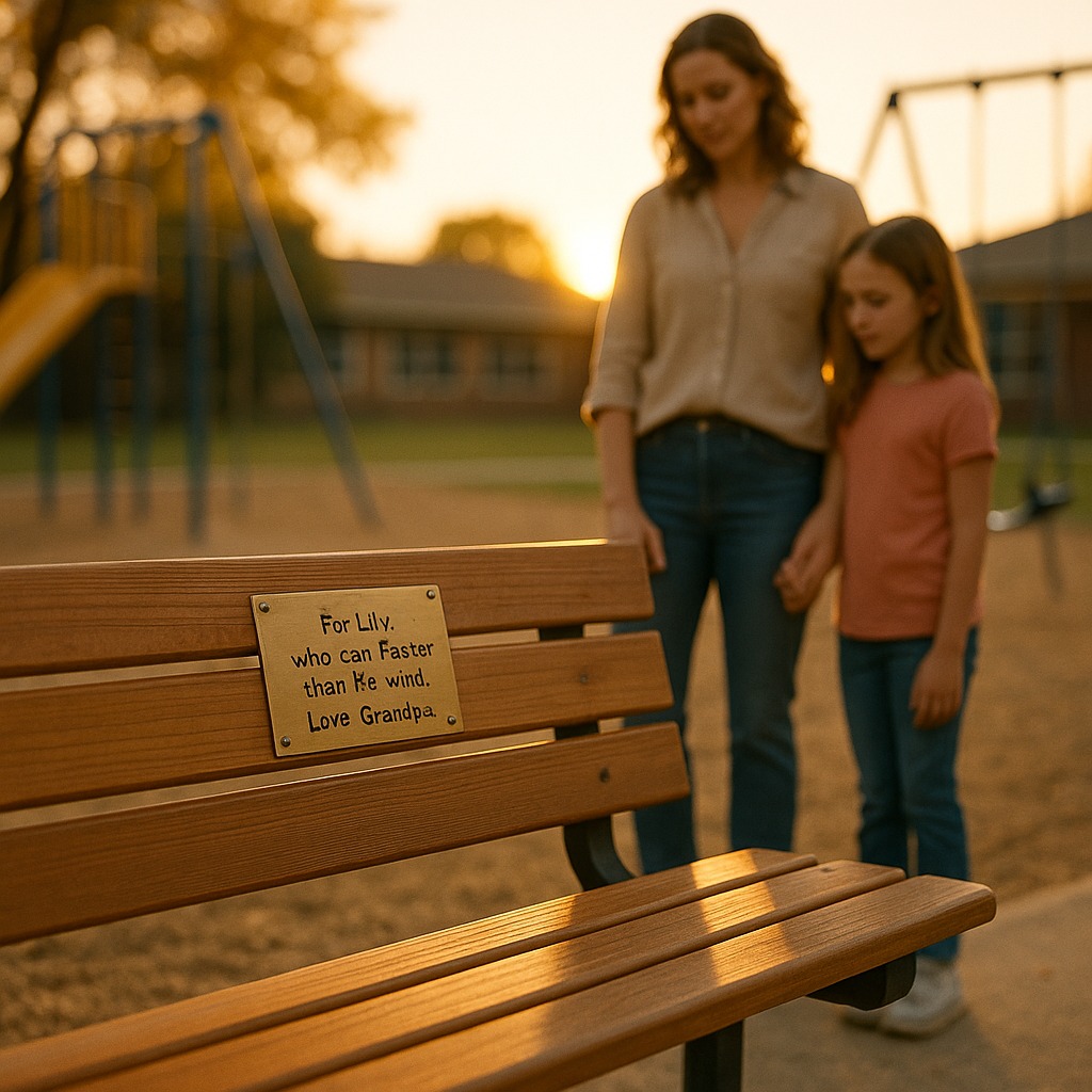 Quella sera ho accompagnato Emma alla panchina. Il sole stava tramontando, inondando il parco giochi di una morbida luce dorata. La targa era fresca sotto le mie dita. Ho immaginato una bambina con le trecce che correva verso un anziano proprio in quel punto.