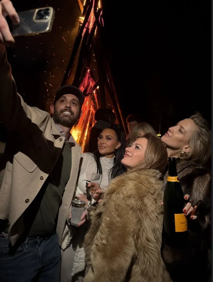 In uno dei momenti salienti della serie di foto, Hudson ha condiviso alcuni scatti di Kardashian in posa accanto a lei, all’attrice Meredith Hagner e al manager Cade Hudson davanti a un falò scoppiettante. Kardashian ha optato per un dolcevita bianco trasparente sopra un reggiseno scollato, capelli lisciati all’indietro: un look sobrio per i suoi standard, ma comunque inconfondibilmente degno di finire sui giornali.