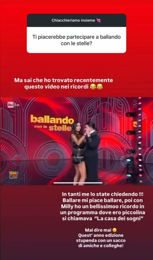 Infine, non è mancato un accenno al futuro televisivo. Alcuni fan la vorrebbero nel prossimo cast di Ballando con le Stelle e lei non ha chiuso la porta. Ha raccontato che ballare le piace e che con Milly Carlucci ha un bellissimo ricordo legato a un programma del passato. Per ora non c’è nulla di certo, ma ha lasciato intendere che nulla è impossibile.