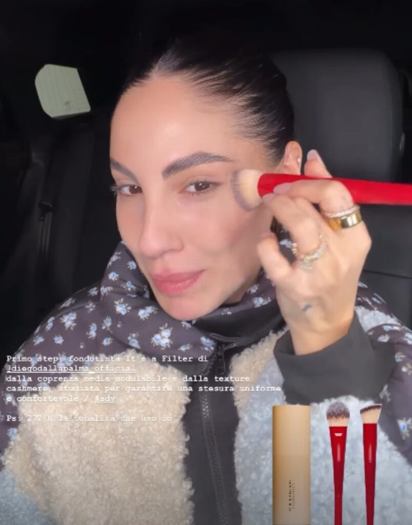 Spiega che, invece di correre a casa o fermarsi apposta, preferisce sistemarsi direttamente in auto. Tra una guida e una pausa, tira fuori il beauty e si trucca lì, con grande naturalezza. Ammette anche di amare guidare, motivo per cui passa moltissimo tempo in macchina e ha trasformato quell’abitacolo in uno spazio tutto suo.