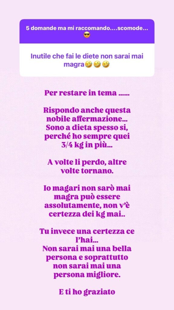 Poi arriva la replica che ha fatto il giro dei social. Karina ammette che forse non sarà mai magra, e che sui chili non esistono certezze. Ma sull’utente che l’ha attaccata sì. Gli scrive chiaramente che non sarà mai una bella persona e, soprattutto, non sarà mai una persona migliore. Chiude dicendo di averlo persino risparmiato, lasciando intendere che avrebbe potuto essere molto più dura.
