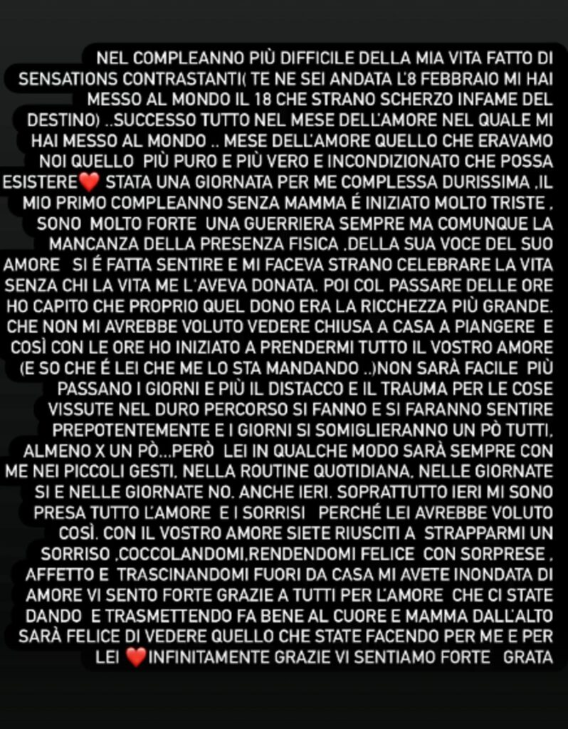 Nelle sue Storie, l’ex gieffina vip racconta quanto sia stato difficile anche solo pensare di festeggiare. La coincidenza delle date rende tutto ancora più lacerante: la madre se n’è andata l’8 febbraio, lei è nata il 18. Lo stesso mese, quello che per loro rappresentava l’amore più puro, vero e incondizionato.