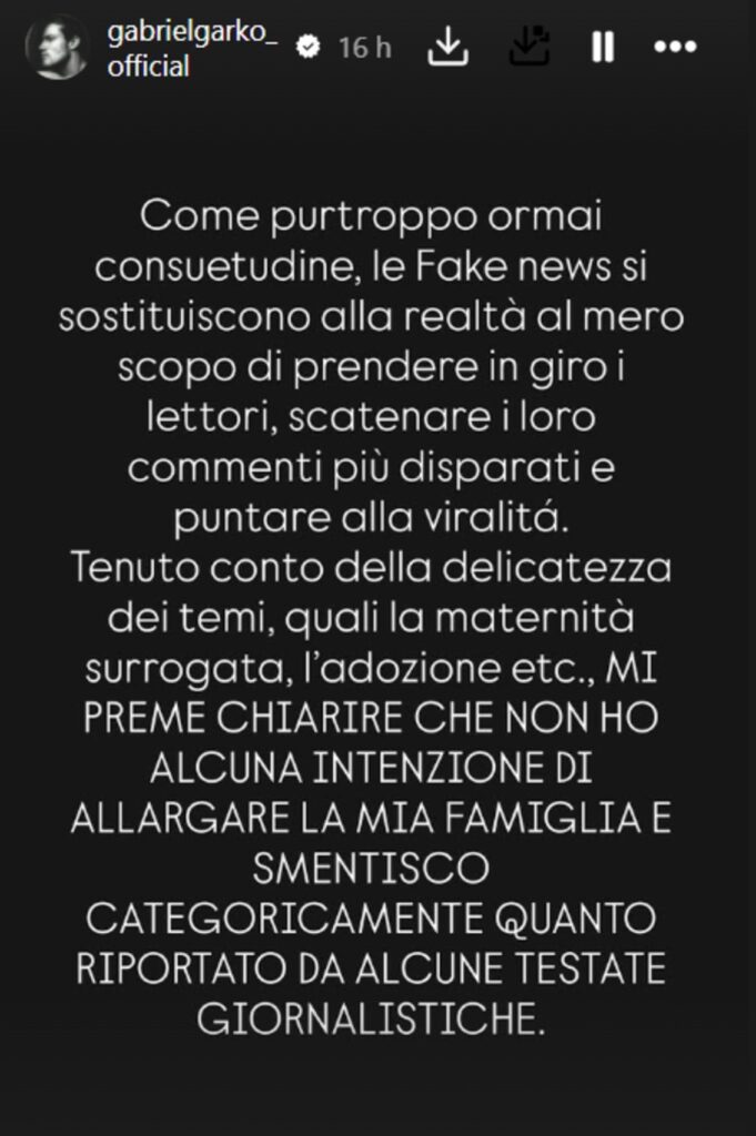 Questa volta non ha lasciato spazio a interpretazioni. Gabriel Garko ha scelto le sue Storie per mettere un punto definitivo ai rumors che parlavano di una possibile adozione insieme al marito Giorgio. E lo ha fatto con toni durissimi.
