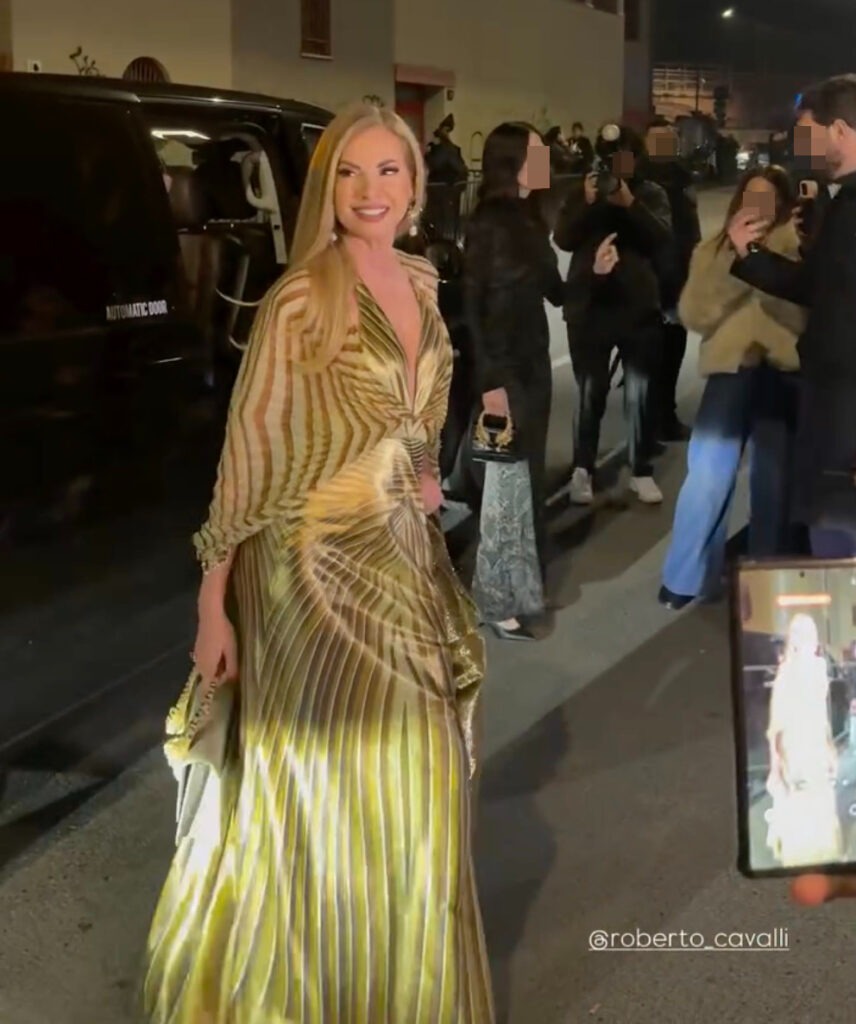 Cinquantotto anni lei, venti lei. Madre e figlia fianco a fianco, davanti ai fotografi, con abiti “matchy matchy” che richiamavano l’inconfondibile cifra stilistica dello stilista scomparso nel 2024. Le linee, le texture, la luce dei tessuti: tutto parlava il linguaggio Cavalli.