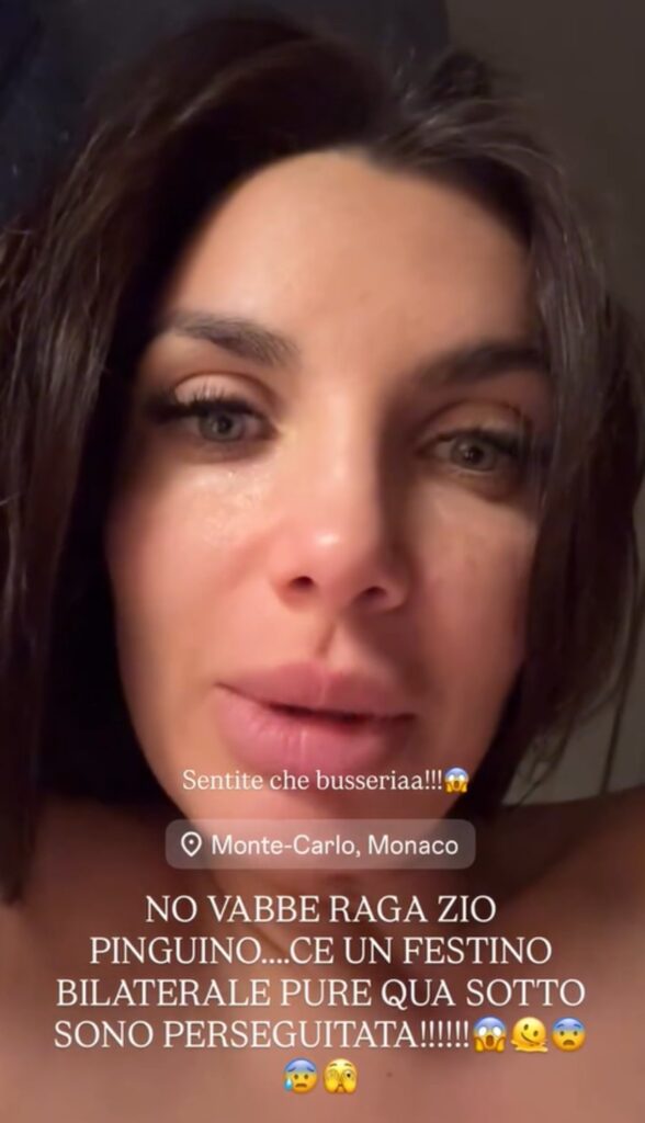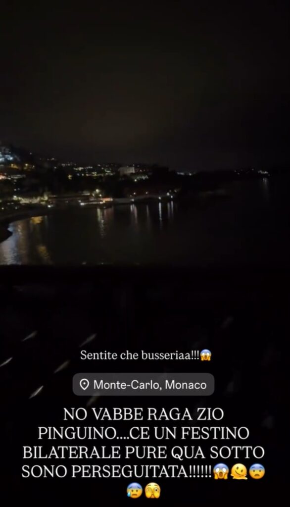 Una volta arrivata in hotel a Monte Carlo, la sorpresa non è stata delle più piacevoli. Anche lì, sotto la sua finestra, la musica rimbombava senza sosta. Nelle Stories ha condiviso un video in cui si sente chiaramente il volume altissimo, commentando sconsolata: “Sentite che busseria! No, vabbè, raga, zio pinguino… c’è un festino bilaterale pure qua sotto: sono perseguitata!”.