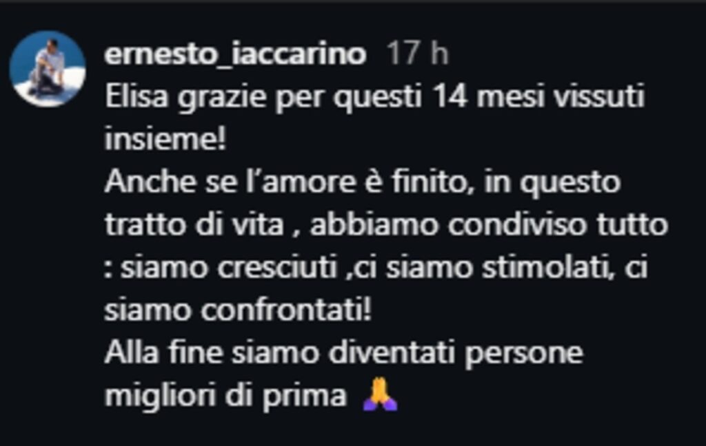 Nel messaggio che accompagna la foto, Iaccarino ha voluto dedicare alla ormai ex compagna un pensiero più articolato. Ha scritto che, nonostante l’amore sia finito, quel periodo della loro vita è stato importante. Ha ricordato i momenti condivisi, le esperienze vissute insieme e il fatto che entrambi, lungo quel percorso, si siano arricchiti e stimolati a vicenda.