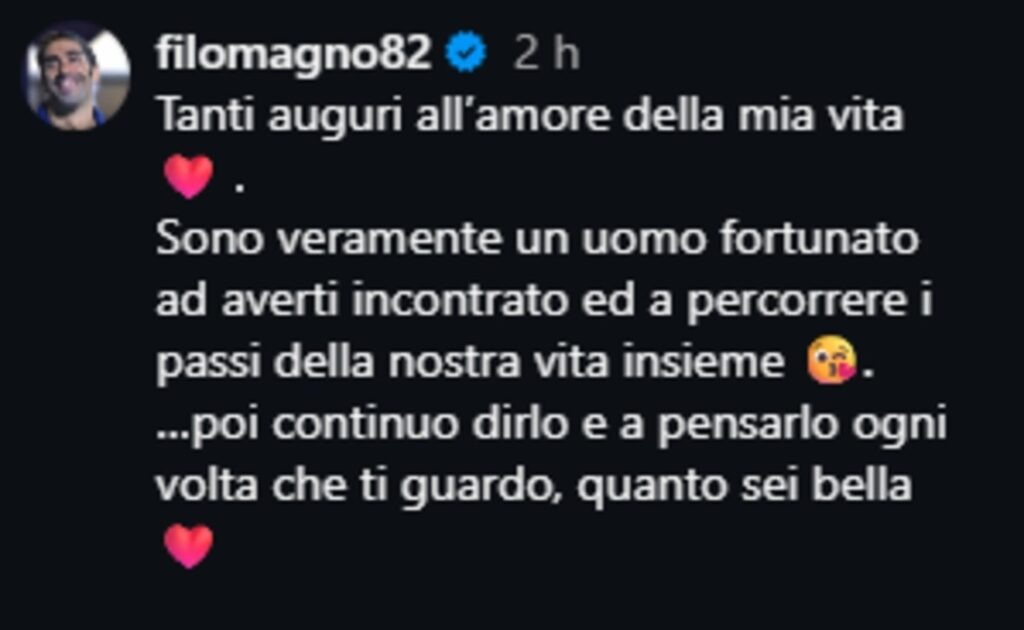 Nel suo messaggio di auguri, Magnini ha voluto esprimere tutta la sua ammirazione per la moglie. Ha scritto di sentirsi un uomo molto fortunato per averla incontrata e per condividere con lei il cammino della vita. Non ha nascosto neppure quanto la trovi ancora bellissima ogni volta che la guarda.