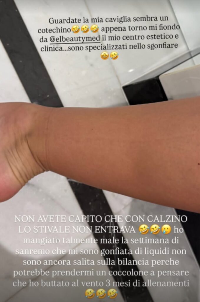 Subito dopo, Elettra ha mostrato ai follower la sua caviglia gonfia con una foto. “Guardate la mia caviglia, sembra un cotechino”, ha commentato con ironia.