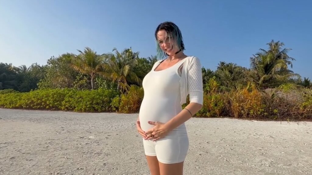 Nonostante questo, il pancione ormai ben visibile lascia intuire che l’attesa è già in una fase avanzata.