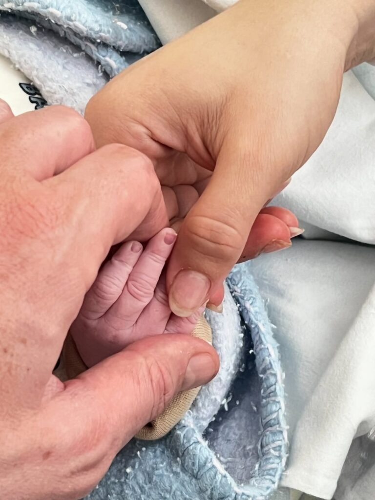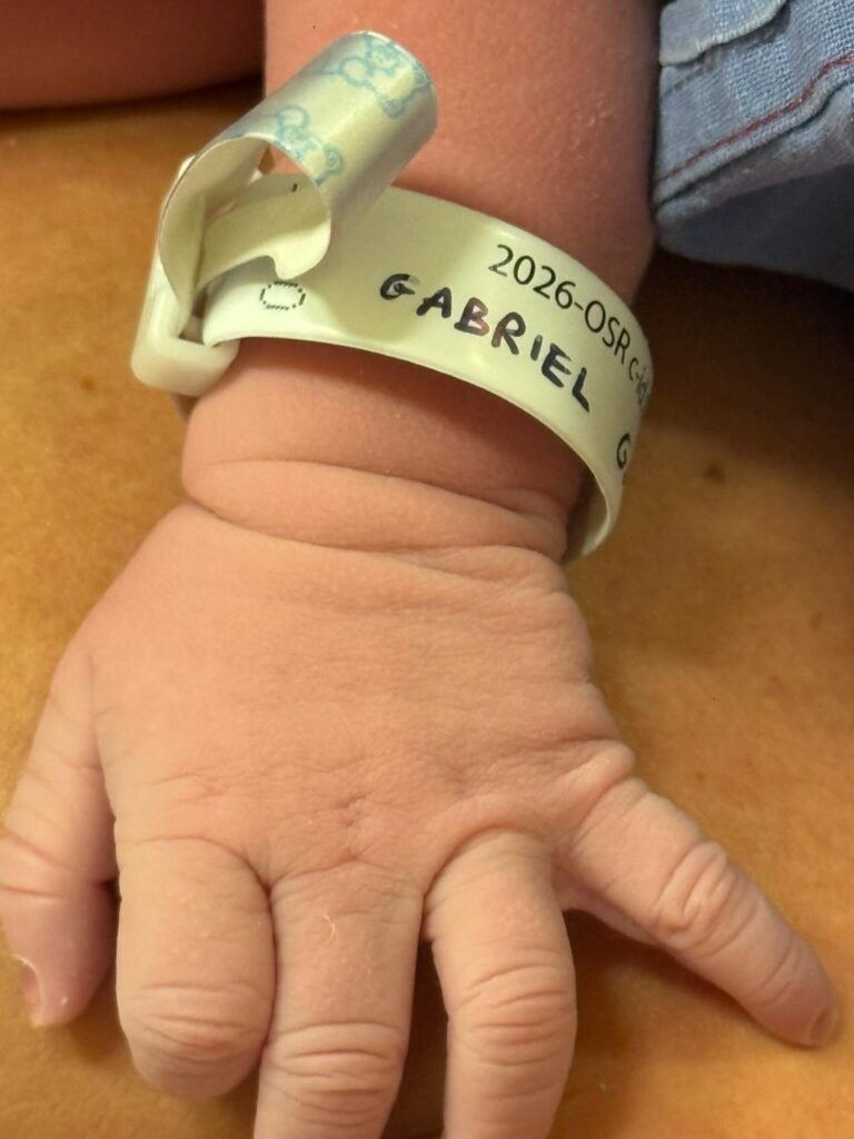 Tra le foto condivise, quella della mano di Gabriel con il braccialetto dell’ospedale, uno scatto che indica giorno e ora della nascita, e una tenera immagine in cui i genitori stringono la mano del loro bambino. Non manca nemmeno il fiocco appeso alla porta della camera della mamma, con il nome del piccolo scritto sopra.