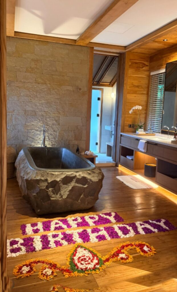 All’arrivo, ad aspettarla, c’era un resort di lusso immerso nella natura. Nella villa scelta per loro, una scena che non lascia spazio a dubbi: petali di fiori disposti con la scritta “Happy Birthday” all’ingresso. Un’accoglienza che ha subito reso l’atmosfera ancora più speciale.
