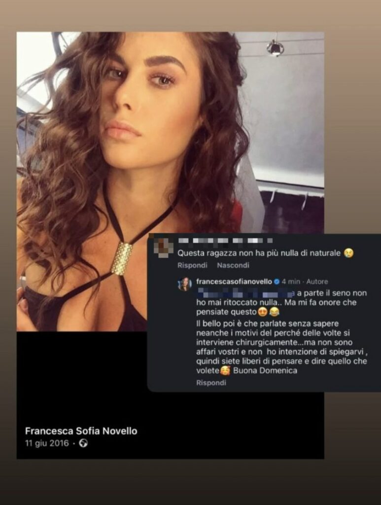 Francesca non lascia correre. Risponde direttamente e chiarisce una volta per tutte la questione. Ammette di aver fatto solo un intervento al seno e di non aver mai ritoccato altro. Poi aggiunge, con ironia, che quasi le fa piacere che qualcuno pensi il contrario.