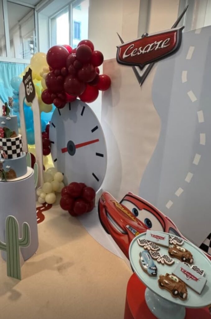 Ogni elemento della festa richiamava quell’universo. Il rosso acceso dominava la scena, richiamando il personaggio di Saetta McQueen, mentre il bianco e nero delle bandiere a scacchi completavano l’atmosfera da gara. Tra palloncini, decorazioni e dolci personalizzati, tutto era pensato per creare un ambiente immersivo.