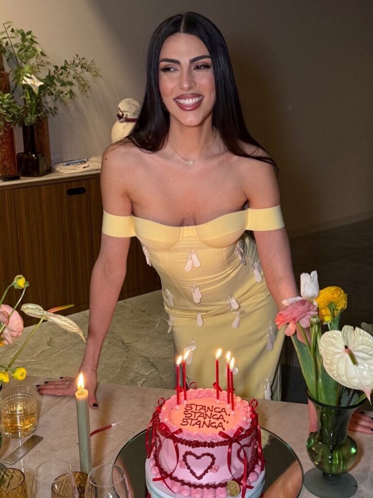La festa è iniziata già la sera del 31 marzo, con una cena intima insieme agli invitati, per poi proseguire oltre la mezzanotte con il brindisi ufficiale. Proprio in quel momento Giulia ha spento le candeline su una torta rosa decorata con cuori rossi e una frase che ha attirato l’attenzione: “Stanca, stanca, stanca”.