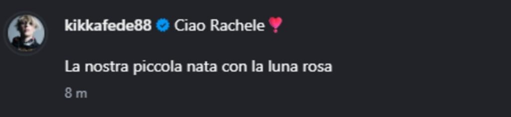 Nel messaggio condiviso sui social, la coppia ha salutato così la piccola: “Ciao Rachele. La nostra piccola nata con la luna rosa”. Una frase breve, ma carica di emozione, che ha immediatamente fatto il giro del web, raccogliendo migliaia di reazioni.