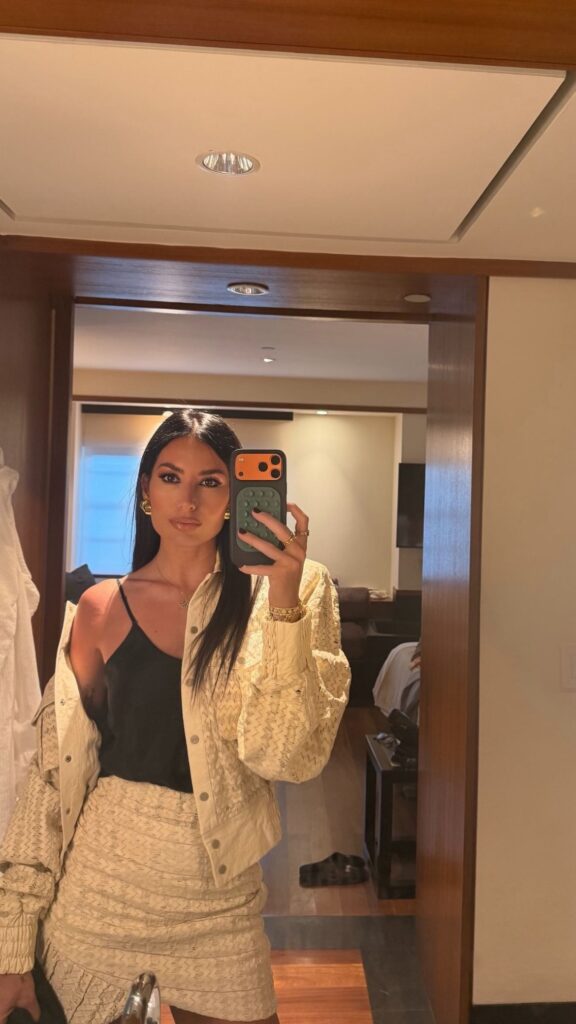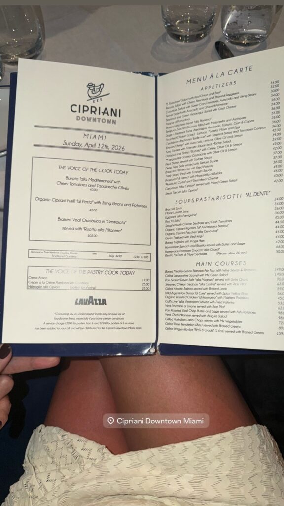 La serata si svolge in uno dei locali più conosciuti di Miami, il Cipriani Downtown. A tavola c’è un’atmosfera rilassata, fatta di complicità e sorrisi. Elisabetta si presenta con un completo bianco con mini, curato nei dettagli, perfettamente in linea con il contesto elegante della città.