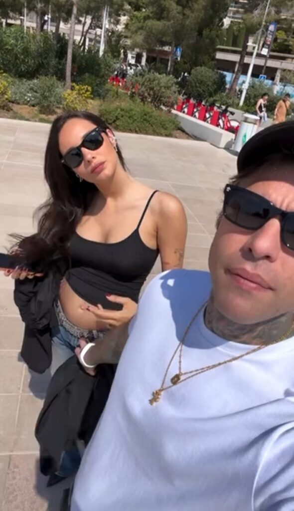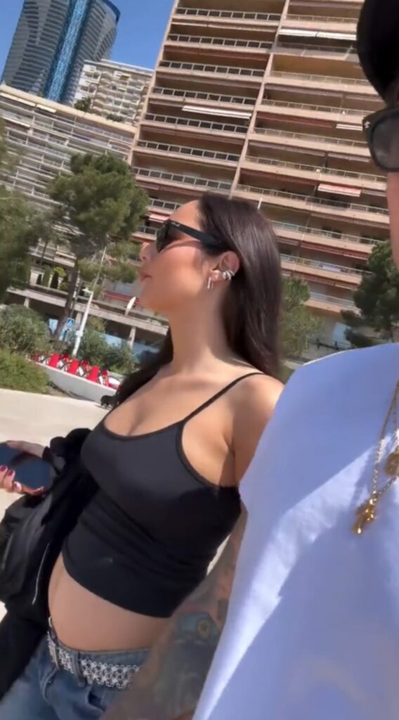 Canottiera nera, jeans e atteggiamento leggero: la giovane stilista non sembra voler nascondere nulla. Anzi, mostra con naturalezza le forme della gravidanza mentre cammina accanto al rapper. In un altro scatto, cambia outfit ma non l’effetto: una t-shirt corta e pantaloni in denim mettono ancora più in risalto il ventre che cresce.