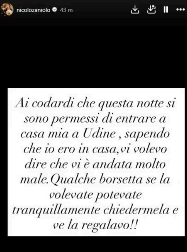 Nicolò Zaniolo non trattiene la rabbia e sceglie i social per dire tutto. Il calciatore, 26 anni, si ritrova al centro di una situazione che scuote la sua vita privata: una rapina nella sua abitazione a Udine, avvenuta mentre lui e la sua famiglia erano fuori città.