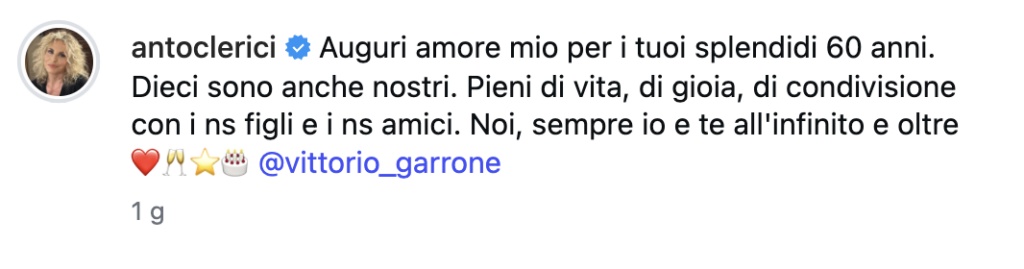 Antonella Clerici non ha bisogno di grandi gesti per far parlare di sé. Basta un post, qualche immagine scelta con cura e una frase che dice tutto. Per i 60 anni di Vittorio Garrone, festeggiati il 27 aprile, la conduttrice decide di condividere un momento intimo, fatto di ricordi e sentimenti veri.