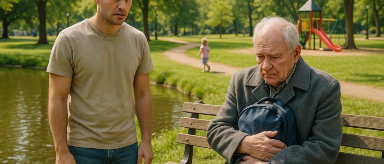 Il vecchio continuava a sedersi ogni giorno sulla stessa panchina del parco con un piccolo zainetto blu, finché un pomeriggio piovoso uno sconosciuto lo aprì e capì perché